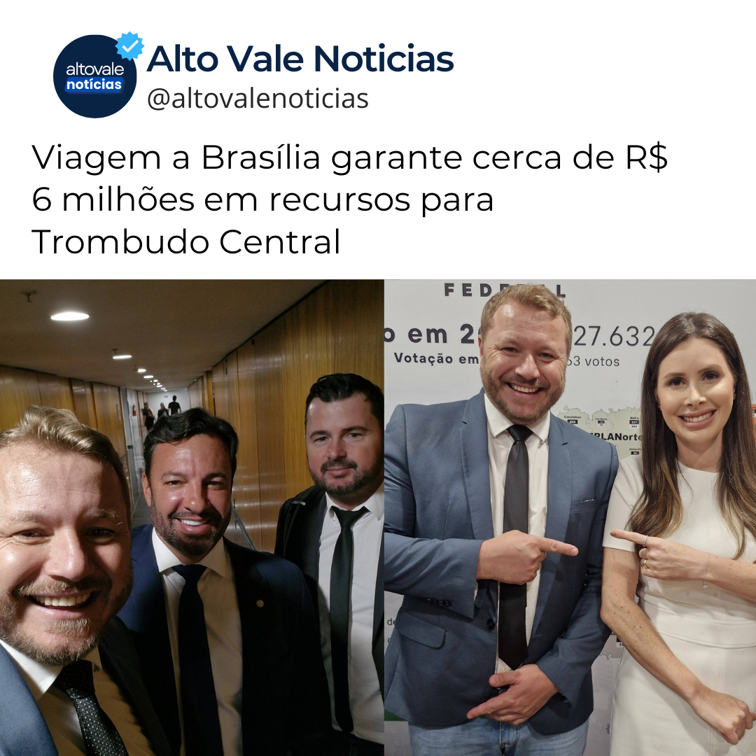O prefeito de Trombudo Central, Marlon Goede, destacou em uma publicação nas redes sociais uma agenda marcada por dias intensos de trabalho em Brasília. Segundo ele, a série de reuniões com deputados federais e senadores resultou em uma importante conquista para o município: a garantia de cerca de R$ 6 milhões em recursos, que deverão ser destinados a projetos voltados ao desenvolvimento de Trombudo Central e à melhoria da qualidade de vida da população.